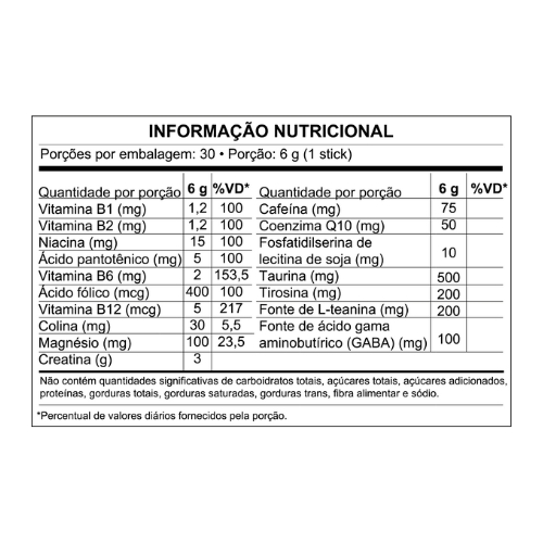 A presença de Cafeína promove estado de alerta e disposição, enquanto ativos como Fosfatidilserina, Colina, Tirosina e Taurina oferecem suporte à memória, concentração e clareza mental. A fórmula é equilibrada com L-Teanina e GABA, que auxiliam no foco com controle do estresse, além de Magnésio e Coenzima, que contribuem para o metabolismo energético e função neuromuscular.